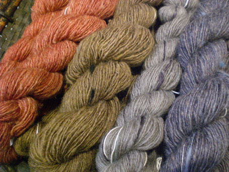無地用の糸4色 September 29, 2007 作品展まで2ヶ月切ってしまいました。 そういえば、無地のものってあまりなかったなーと思い立ち、4枚分それぞれの色で糸を紡いだ。 トマトのような赤、コンクリートのようなグレー、タイで見た、お祈りをしながら仏像にはっていた金箔のような金茶、そして夏の朝顔のような紫。 自然の色がたくさんの色から構成されているように、私もそれぞれいろいろな色を掛け合わせて色を作っていきました。 「紡ぎ」カテゴリの最新記事 < 前の記事次の記事 > トラックバック