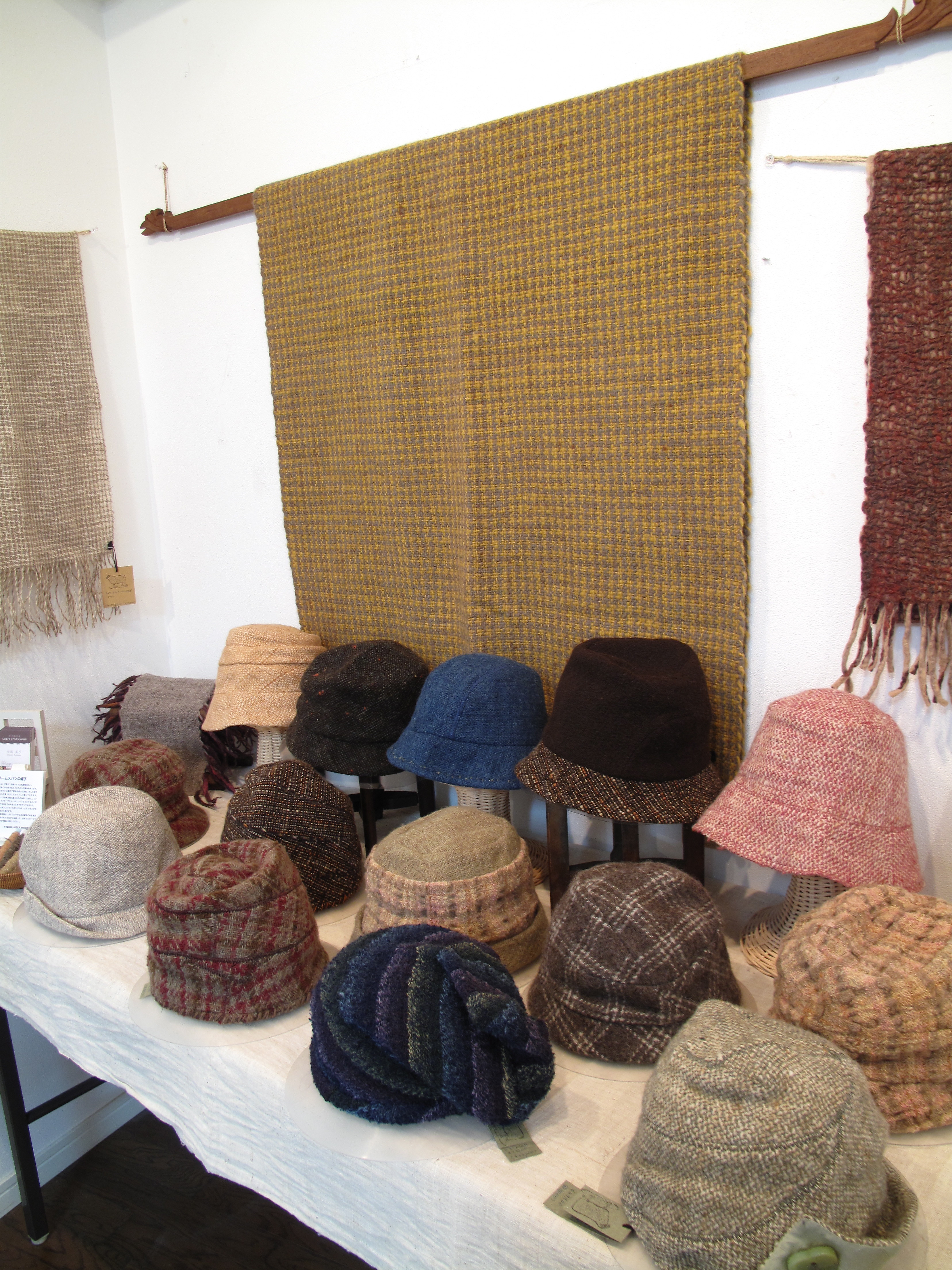 前列手前から2つ目の紺色のはスピナーズファームタナカさんのコンテストで一等賞になった強撚グラデーションの帽子です。
