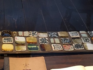 古布の店で珍しい型染めの端切れを仕覆用に買い、